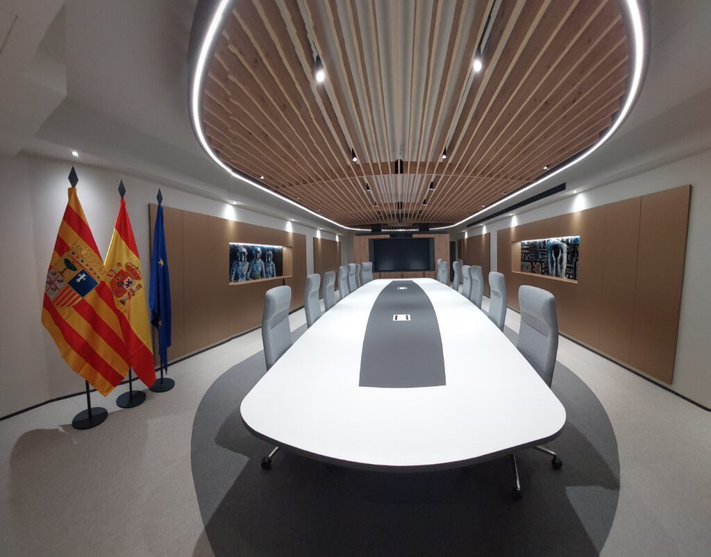 Cuenta con la más moderna tecnología para la realización de presentaciones y videoconferencias. Un mueble separador hace la función de biombo, para la privacidad de las reuniones y para integrar una pantalla de 80 pulgadas, que da apoyo a una nueva zona más informal. También tiene una zona en la entrada, dotada con nevera y vinoteca, para poder dar la bienvenida, como paso previo a las reuniones.