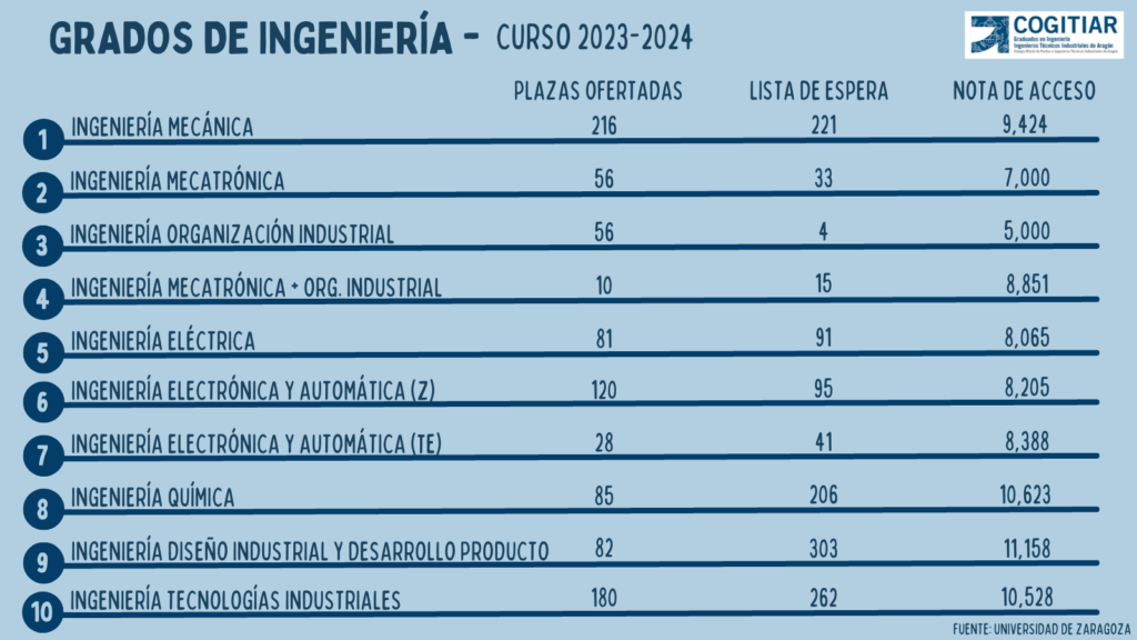 Si todos los grados de Mecánica, Eléctrica, Mecatrónica, Electrónica y Automática, Diseño Industrial y Desarrollo, Química, Organización Industrial y Tecnologías Industriales llenaran todas las plazas que se ofertan en la Escuela de Ingeniería y Arquitectura (EINA), la Escuela Universitaria Politécnica de La Almunia (EUPLA) y la Escuela Universitaria Politécnica de Teruel (EUPT), más de 900 alumnos se graduarían cada curso. Esta cifra de recién titulados cubriría la escasez de profesionales que reclama no solo COGITIAR, sino también otras organizaciones empresariales del sector de la automoción o de la energía.