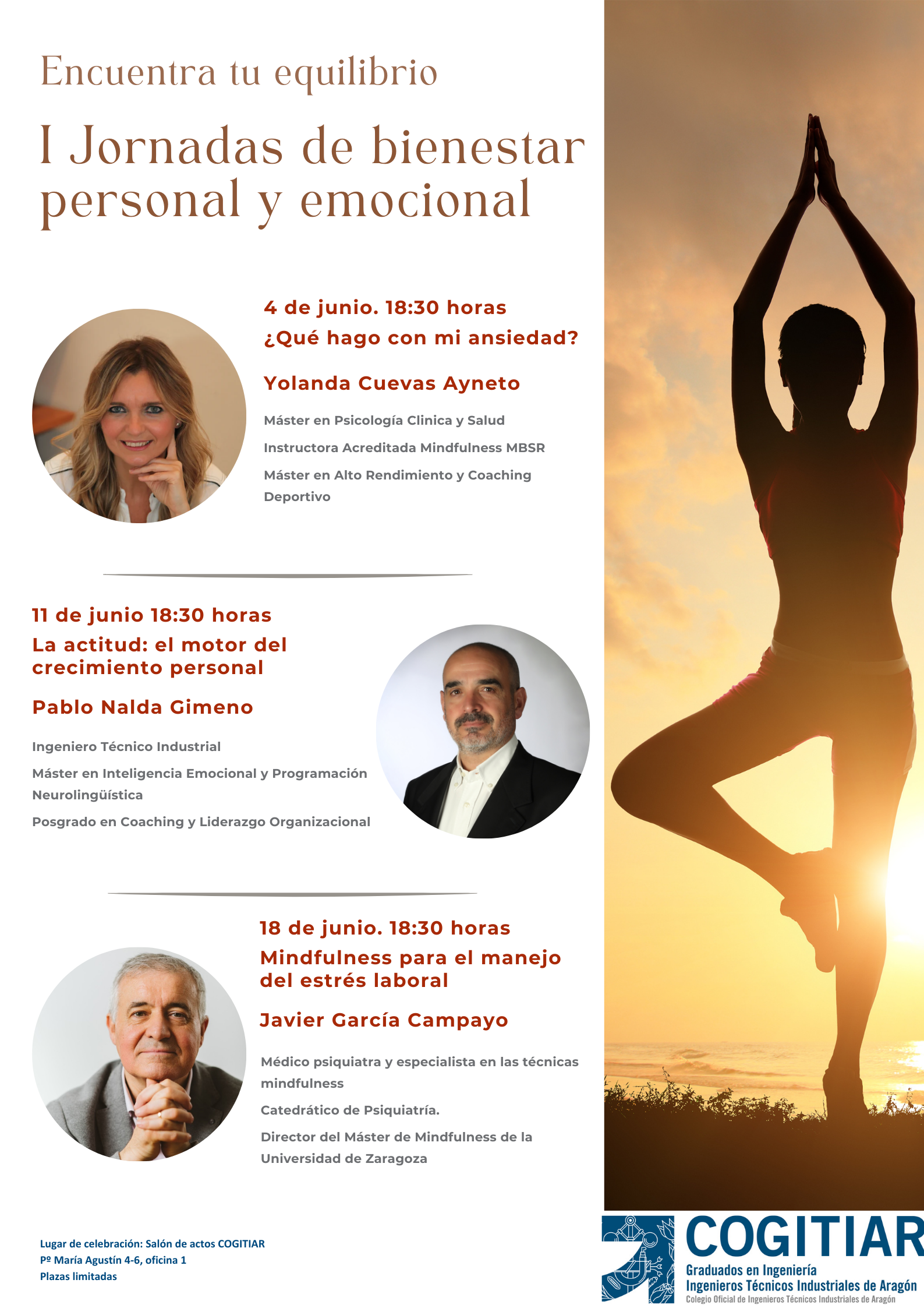 Desde COGITIAR, queremos fomentar iniciativas que pongan el foco en el bienestar emocional de nuestros colegiados. Por ello, hemos programado las I Jornadas de Bienestar Personal y Emocional. Durante tres días, ofreceremos herramientas prácticas para mejorar tu calidad de vida aprendiendo a gestionar tus emociones de manera efectiva. Descubre cómo fortalecer tu bienestar emocional.