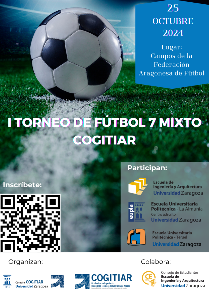 COGITIAR, a través de su Cátedra, organiza el I Torneo de Fútbol 7 Mixto COGITIAR en el que competirán estudiantes de la Escuela Universitaria Politécnica de La Almunia de Doña Godina, la Escuela Politécnica Universitaria de Teruel y la Escuela de Ingeniería y Arquitectura.