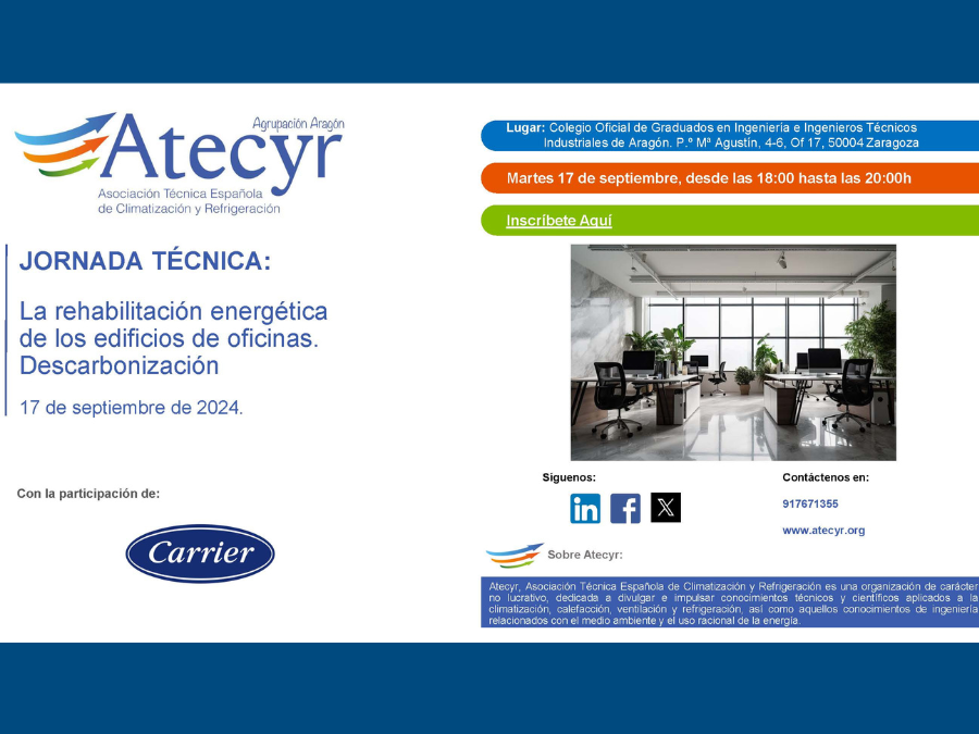 Atecyr, en colaboración con Carrier organiza una Jornada Técnica gratuita que abordará “La rehabilitación energética de los edificios de oficinas, descarbonización”.