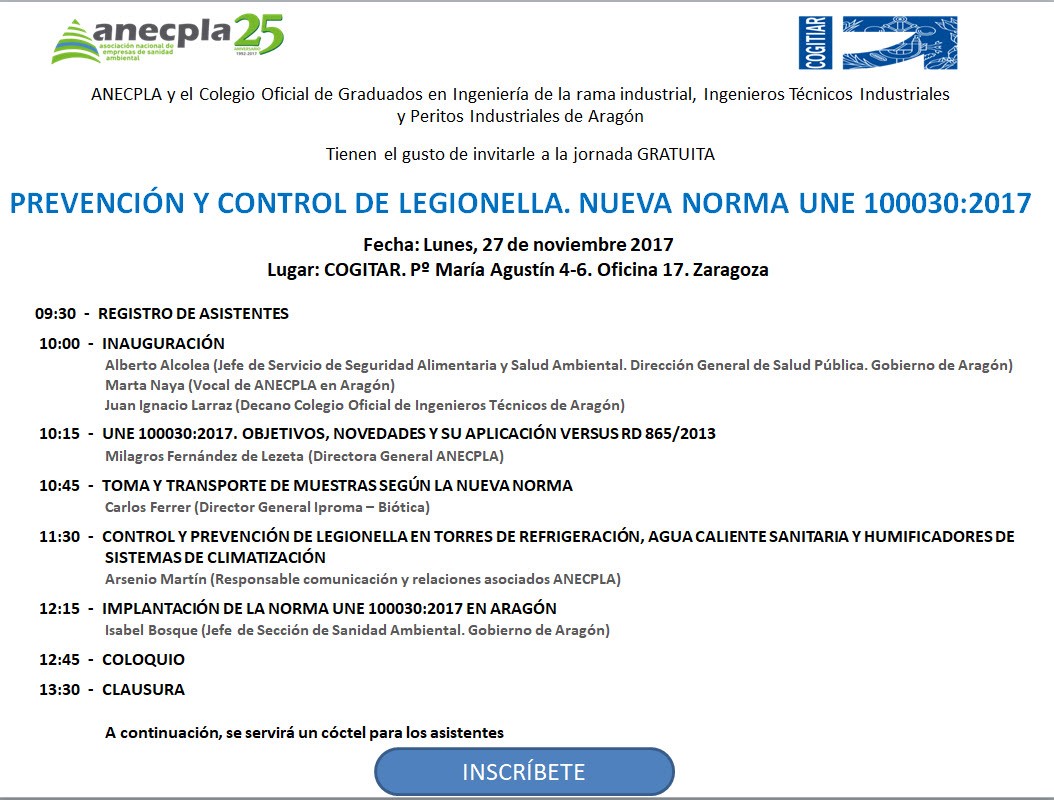 ANECPLA y el COGITIAR han preparado una Jornada Técnica Gratuita sobre Prevención y Control de Legionela. Nueva norma UNE 100030:2017, que se celebrará el próximo lunes 27, a partir de las 9:30 horas, en el salón de actos del Colegio.En los ficheros adjuntos encontrarás el programa detallado de la Jornada así como el formulario que tendrás que cumplimentar para formalizar tu inscripción.