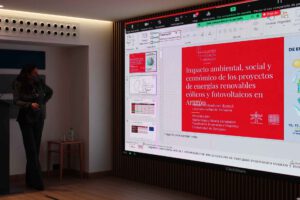 María Blanca Simón abrió el acto con su exposición del estudio ‘Impacto ambiental, social y económico de los proyectos de energías renovables eólicos y fotovoltaicos en Aragón’ para el periodo 2022-2024, elaborado por su departamento a partir de los datos facilitados por el Clúster de la Energía de Aragón (CLENAR). Tras explicar la metodología aplicada, Simón puso de manifiesto que 100 megavatios de energía eólica suponen para la comunidad 115 millones de euros de inversión, en torno a un millar de puestos de trabajo (entre creación y mantenimiento), 100.000 toneladas de emisiones de CO2 que se evitan y 18.000 toneladas de petróleo que no es necesario importar, además de la correspondiente recaudación de impuestos. Las cifras son algo inferiores en el caso de la energía fotovoltaica, si bien, en general, la profesora destacó que el de las renovables “puede situarse como el segundo sector tanto en PIB como en empleo, por detrás de la industria agroalimentaria y por delante de la automoción”.