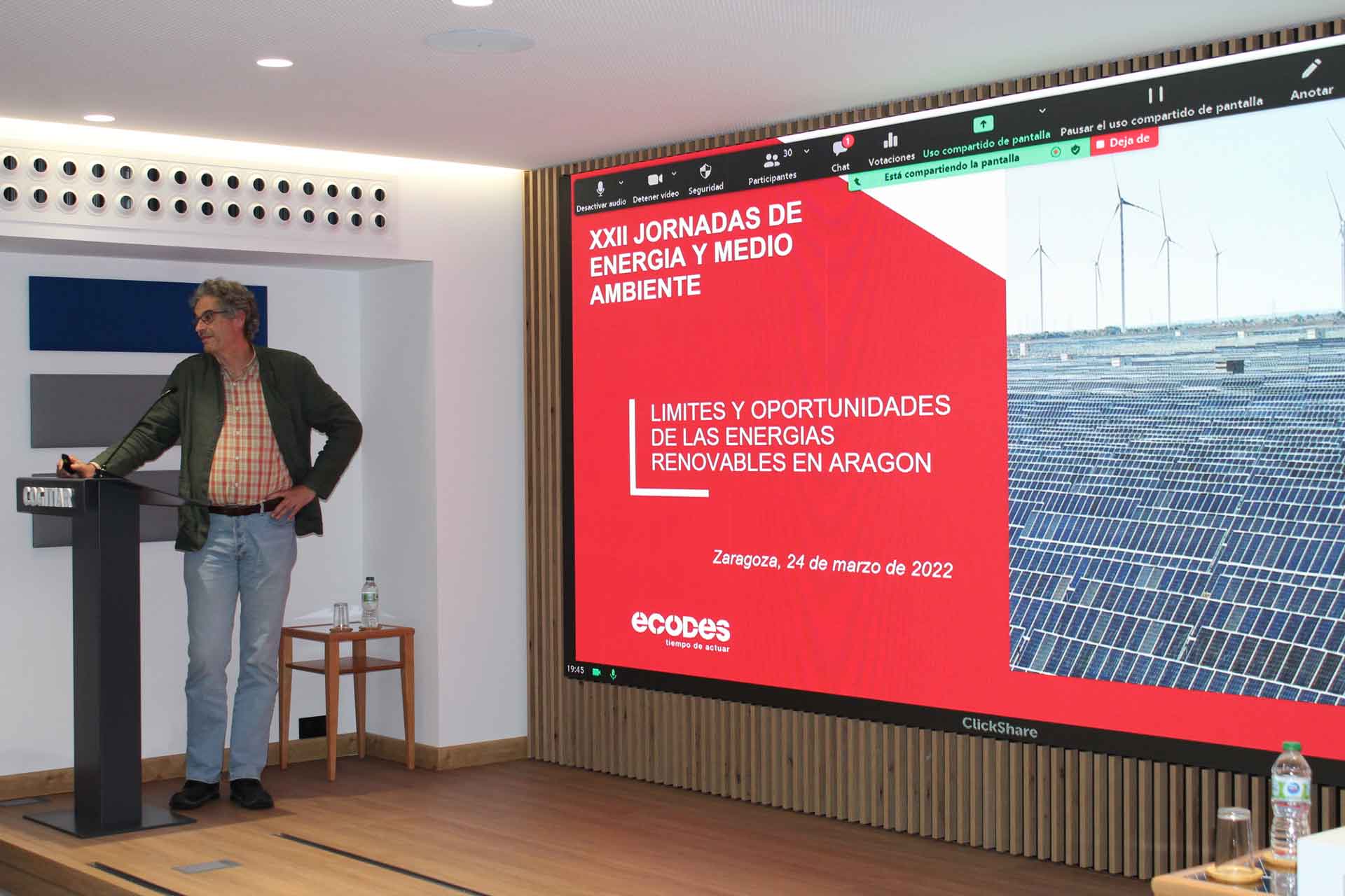 Mario Rodríguez, portavoz de ECODES en la sesión, endureció el tono del discurso ante el momento de “emergencia climática” que vive el planeta y reconoció que “nos vamos a tener que mover en la imperfección porque no hay tiempo para probar medidas y a esperar a ver si funcionan o no”. Rodríguez mostró su preocupación por el rechazo social que están cosechando los proyectos de instalación de renovables. “Corremos el peligro de que se conviertan en inmanejables, por lo que hay que tener inteligencia emocional para que algo con lo que nos estamos jugando el futuro tenga aceptación social”, opinó. En este sentido, apostó por hacer “labor pedagógica” para “atajar a tiempo estos fenómenos y que no se pierda el relato de algo que era bueno y ahora ya no lo es”, dijo en alusión a las recientes protestas en contra de la construcción de parques eólicos y fotovoltaicos en algunas zonas de Aragón. “Claro que hay que escuchar las razones de los demás y repensar algunas cosas, pero no podemos parar”, añadió.