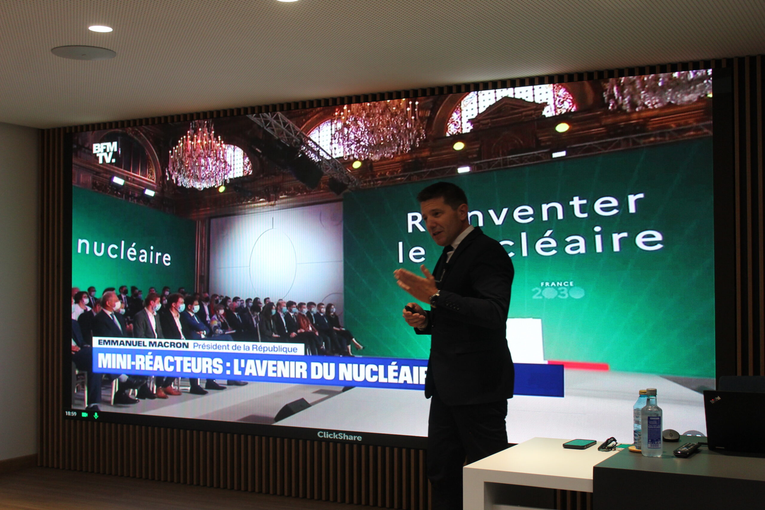 García comenzó su exposición explicando qué es un reactor modular pequeño o SMR. Se trata de reactores nucleares avanzados con una capacidad de potencia de hasta 300 megavatios por unidad, lo que representa cerca de un tercio de la capacidad de generación de los reactores nucleares de potencia tradicionales, y pueden producir grandes cantidades de electricidad con bajas emisiones de carbono. Después, hizo un repaso por los más de 70 diseños de SMR comerciales que se están desarrollando en todo el mundo, entre los que destacó los modulares, las centrales flotantes, los reactores refrigerados por gas a muy alta temperatura, los que emplean sales ya fundidas (en el propio refrigerante llevan disuelto el combustible), los que se refrigeran por metales líquidos como el plomo o los microrreactores. “No son diseños conceptuales, sino realidades que ya están funcionando”, aclaró.
